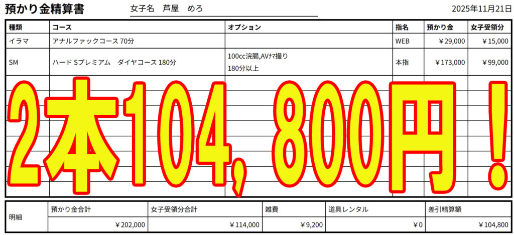 昼間6時間出勤のめろちゃん 2本でナント! 104800円!! とても効率よく稼げました(*´ω`*) 本指名のロングコースが強いですね! 新宿店 林でした!